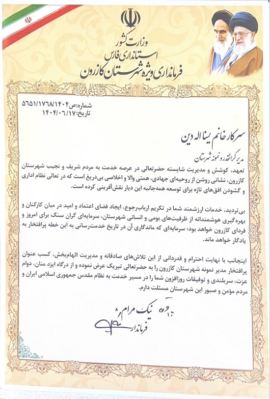 از حسن اعتماد و حمایت های بی دریغ دکتر نیک مرام، فرماندار ویژه شهرستان کازرون، صمیمانه سپاسگزارم و این تقدیر را به فال نیک گرفته و آن را چراغ راهی برای ادامه خدمتگزاری مؤثرتر میدانم./ ز.کیانی